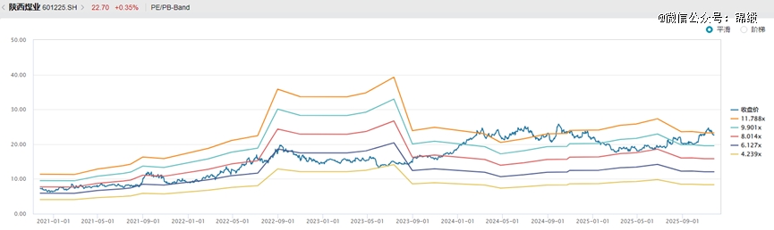 图:陕西煤业近五年市盈率通道(PE-band),存在显著的拔估值的过程