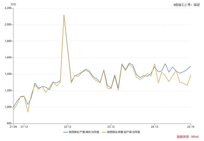 图:陕西煤业近年每月煤炭产量与销量趋势。注:22年产销量高企与电荒下煤炭保供有关