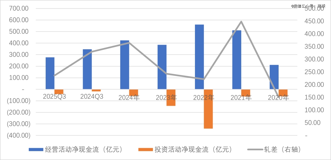陕西煤业近年主要依赖内生性增长,实现总资产、净资产的双增。净资产由20年末的896.69亿元上升至25年三季度末的1378.12亿元,增长53.69%。