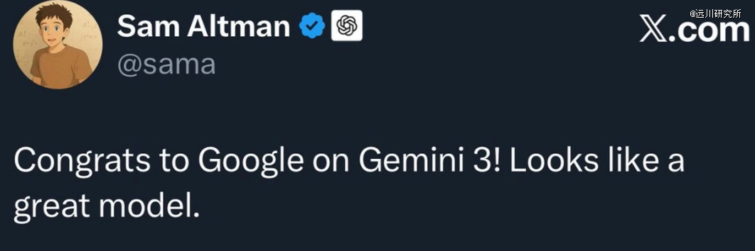 身为友商,奥特曼罕见发推祝贺,称Gemini-3“看起来很棒”,转头在员工备忘录中表示贵司必须得“快速追赶”。