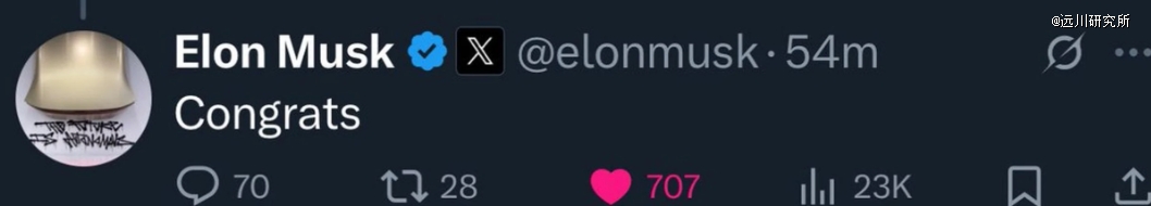 一直对谷歌咬牙切齿的马斯克也破天荒送上了一句“祝贺”(Congrates),精准体现了字数越少,怨气越深。