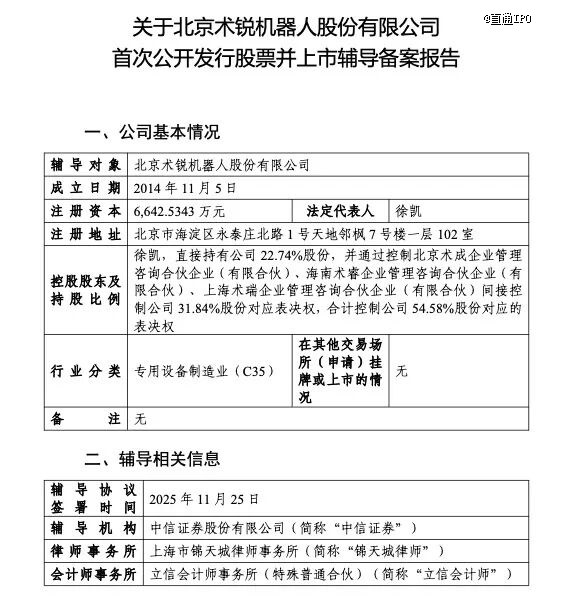证监会官网显示,北京术锐机器人股份有限公司(以下简称:术锐机器人)已在北京证监局完成IPO辅导备案登记,辅导机构为中信证券。