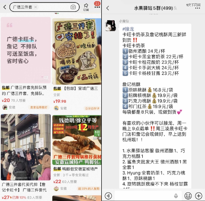 团购经济也被成功点燃。安徽周边城市中,不少水果店、零食店商家在私域社群中发起“广德三件套”代购活动,某杭州水果店的群公告显示,“周一截单后,周三凌晨卡旺卡和詹记门店会现做好,早上配送至杭州。”