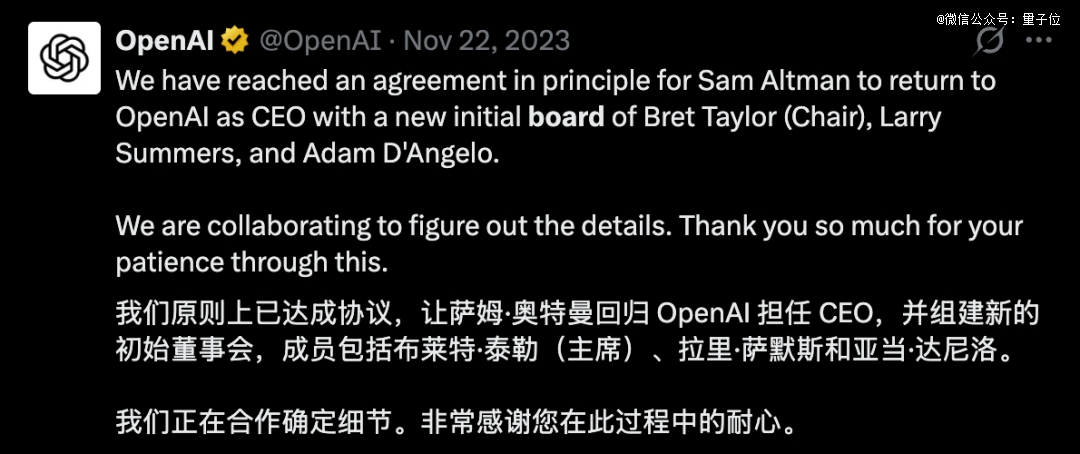 我们对OpenAI董事会的变动感到鼓舞,我们相信这是迈向更稳定、更明智、更有效的治理道路上至关重要的*步。