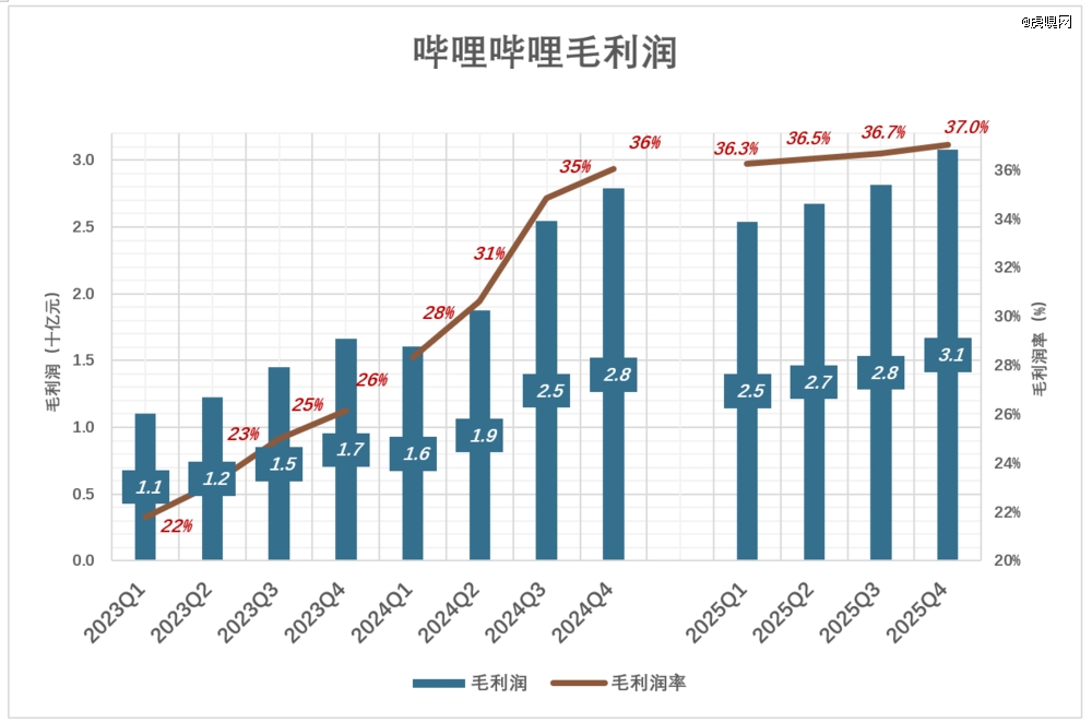 2026年3月5日,哔哩哔哩(NASDA:BILI;HK:09626)发布《2025年第四季度及全年业绩公告》。根据报告,2025年营收303.5亿、同比增长13.1%;净利润11.9亿,首次实现年度盈利。