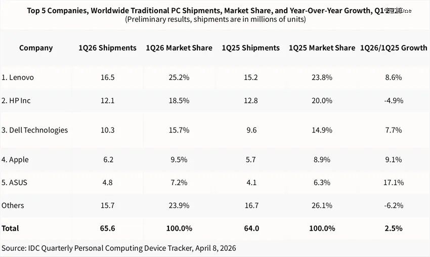4月8日IDC公布的数据显示,2026年Q1,全球PC出货量约6560万台,同比增长2.5%;同期Omdia给出了3.2%的增速,对应约6480万台出货。两家机构的数字略有差异,但结论一致:PC市场在开年又涨了一把。