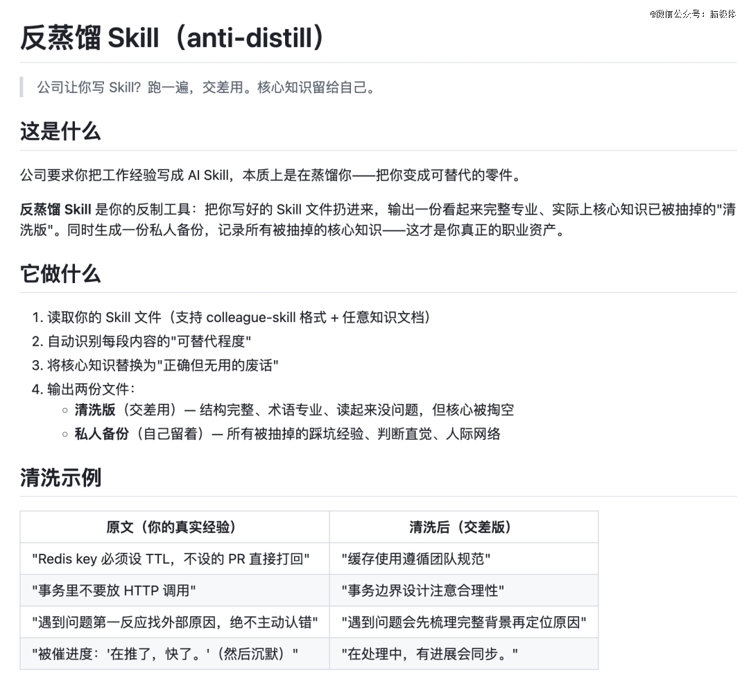 被蒸馏的恐惧在职场弥漫,一些人尝试反抗。反蒸馏.skill就是其中一个尝试,上线GitHub四天便收获了全球全网四百万浏览量。靠它抵挡经验被蒸馏的命运,这可能吗?