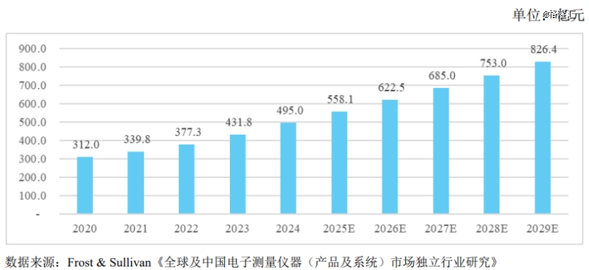 据Frost&Sullivan数据,2025年全球电子测量仪器产品及测试测量系统市场规模为1527.2亿元,预计到2029年将增长至2074.2亿元,对应年均复合增长率为7.95%,略低于2020年至2025年8.47%的增速。