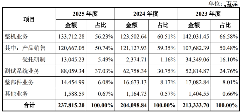 从营收构成来看,2023年、2024年、2025年(简称“报告期”),公司超过56%的营收来自整机业务,测试系统业务的营收占比从24.76%提升至37.03%,整部件及其他业务的营收占比较低。