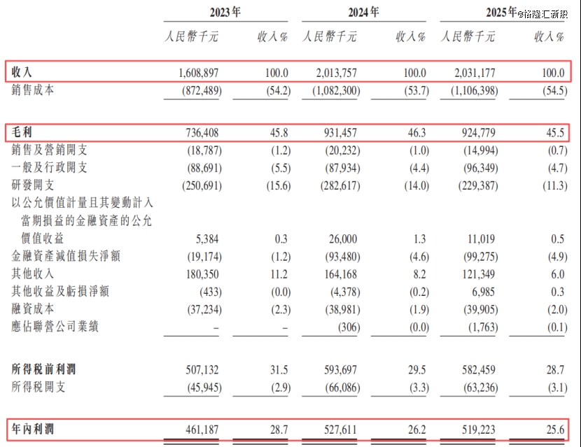2023年、2024年及2025年(报告期),公司的营业收入分别为16.09亿元、20.14亿元、20.31亿元,毛利率分别为45.8%、46.3%和45.5%;公司净利润分别为4.61亿元、5.28亿元、5.19亿元,2025年净利润略有下滑。