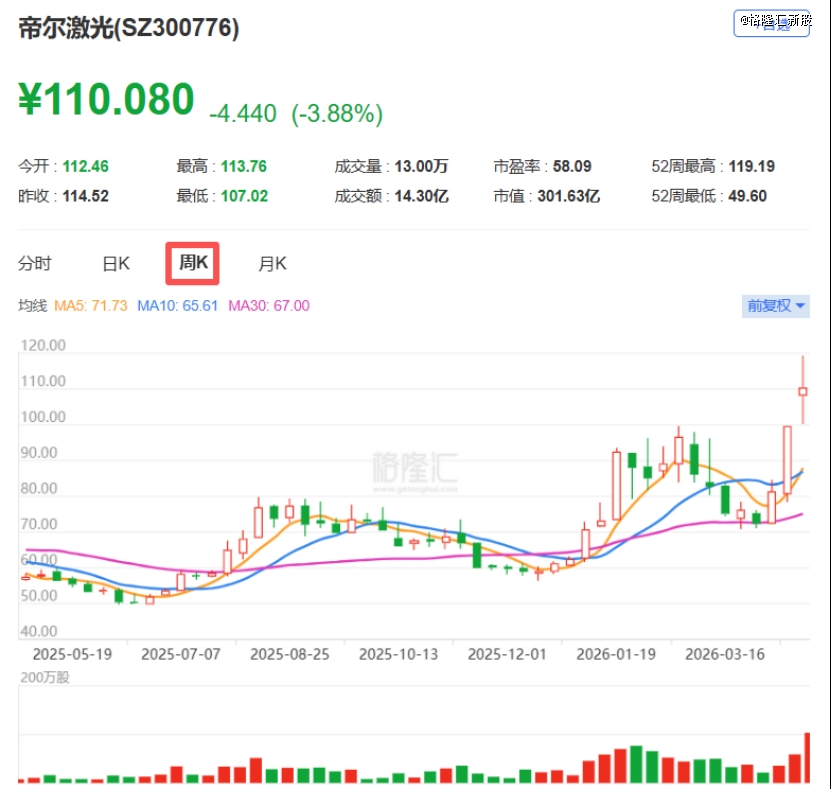 自2019年5月起,帝尔激光的A股在深圳证券交易所创业板上市,股票代码:300776,截至4月24日,帝尔激光股价为110.08元/股,市值301.6亿元,今年以来,公司股价累计涨幅达77.15%。