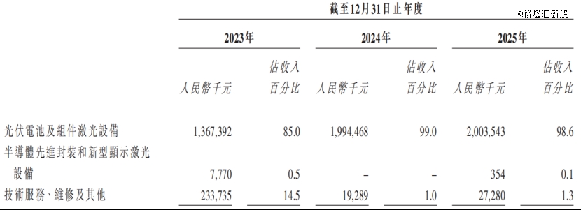 从收入来源来看,光伏电池及组件激光设备占比最高,2025年该部分收入占比高达98.6%,半导体先进封装和新型显示激光设备占0.1%。