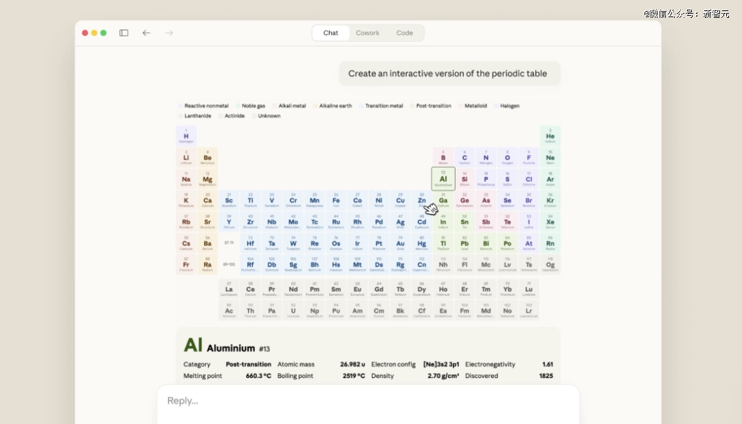 如果你问它关于元素周期表的问题,它能直接画一个可点击的周期表,每个元素点进去都有详细信息。