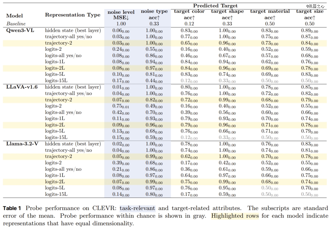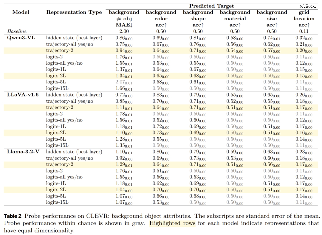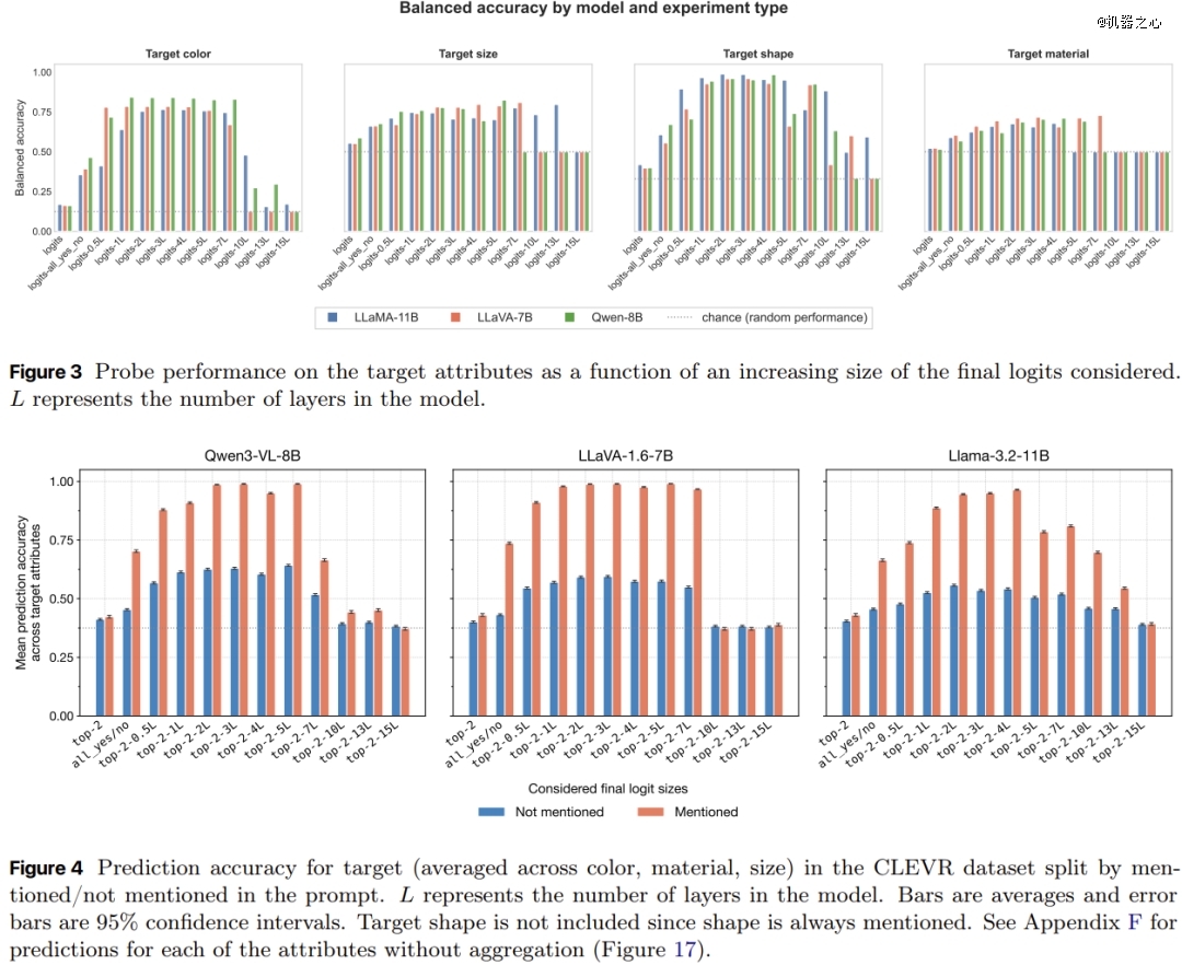 假设我们向模型提问「图片里有一个蓝色的圆柱体吗?」,虽然提示词明确给出了颜色和形状,但完全没有提及该物体的材质和大小。然而,探针依然能从模型最终输出的前 0.5L 数量的候选项中,极其可靠地预测出这个圆柱体究竟是橡胶还是金属材质的,以及它的具体尺寸。