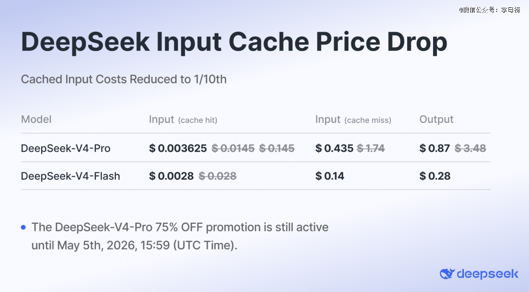 4月25日,DeepSeek-V4-Pro开启限时2.5折优惠,输入价格(缓存命中)降至0.25元/百万tokens。