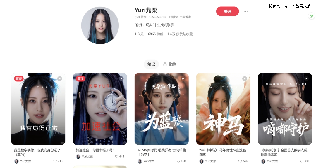 国内的汗青工作室,则是用“人与AI共创”的方式,由一人主导打造出虚拟歌手Yuri尤栗。根据南风窗的报道,工作室创始人赵汗青在Midjourney中只设定了“泛东亚、非标准长相、蓝色”三个方向性标签,通过数千次“抽卡”完成形象筛选,最终在一次偶然的生成中确定了Yuri的外形。虽然看上去好像有些“意外”,但通过这种创作方式,单个创作者也能够完成传统模式下需多人协作的形象设计工作。