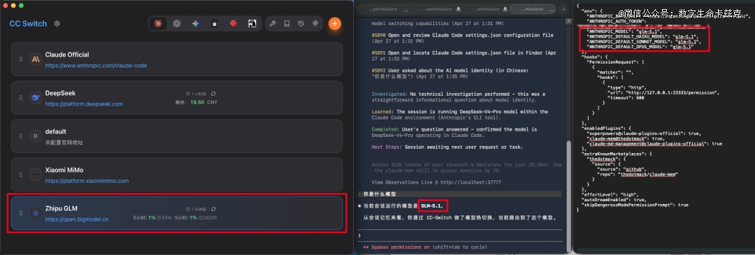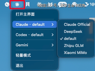 比如你正跑着东西,觉得这个模型不太聪明,你只需要等他回复之后,在菜单栏点一下CC Switch的小图标,选一个别的模型,切完就立刻生效。