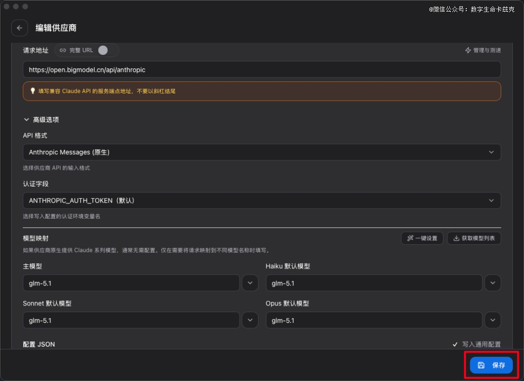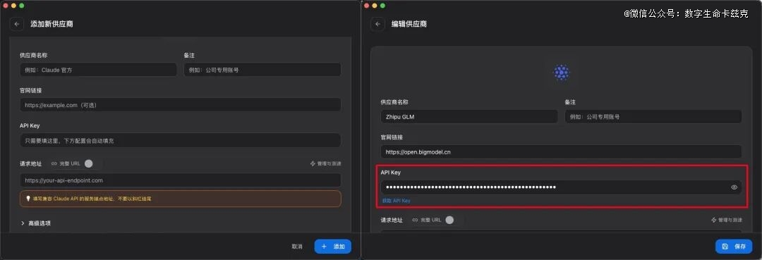 选好供应商之后,除了API Key,剩下的字段它都帮你预填好了,完全不用你操心。