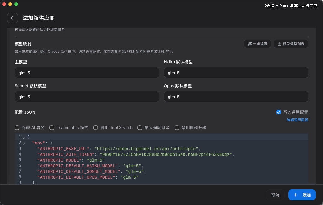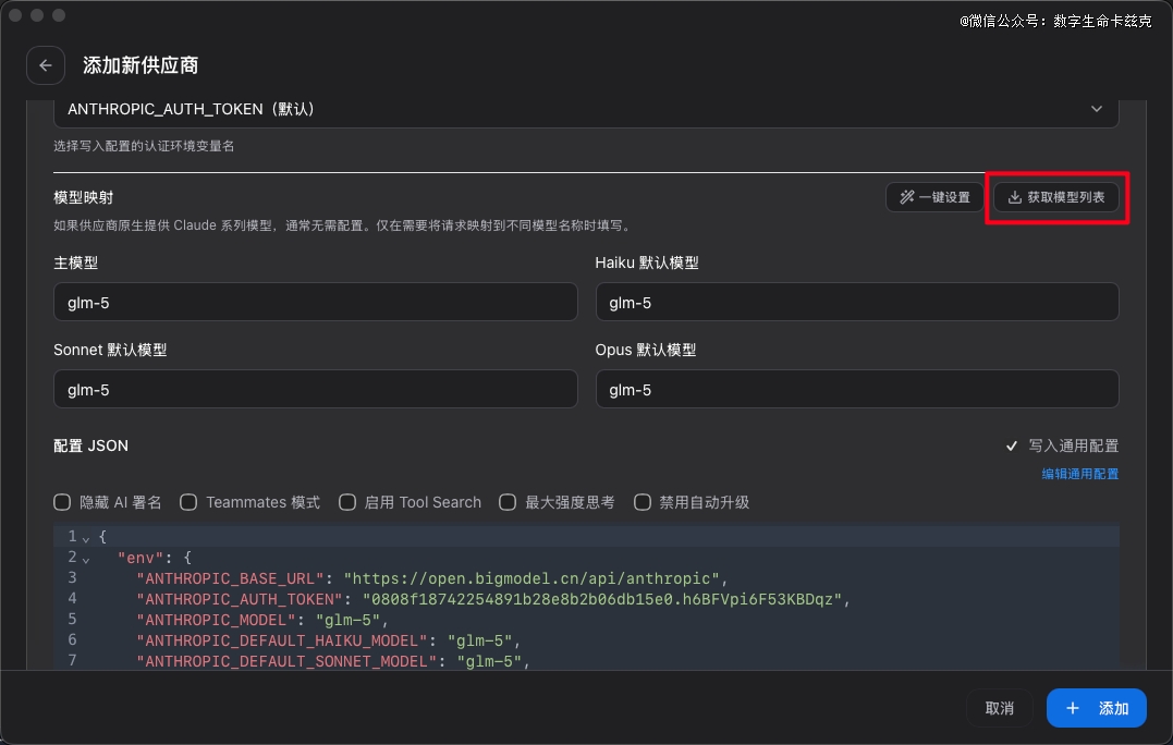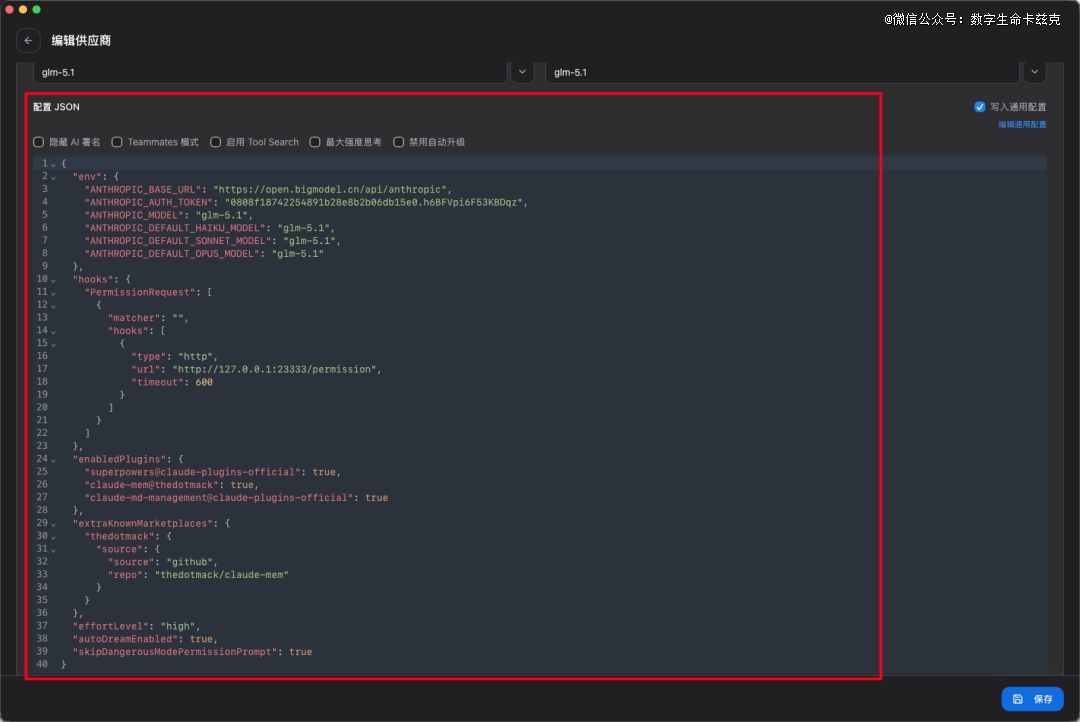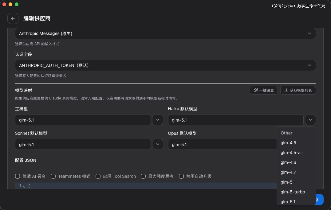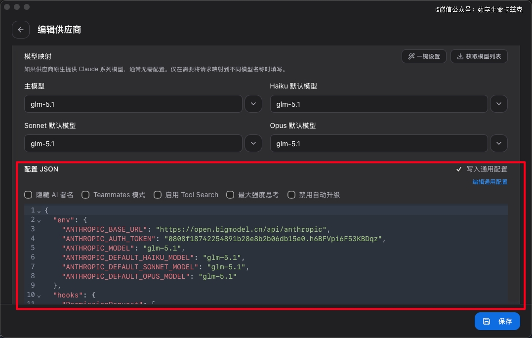 这里的配置json文件,就是CC Switch会写进Claude code的settings.json里面的内容,但其实我们根本不用管。