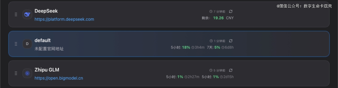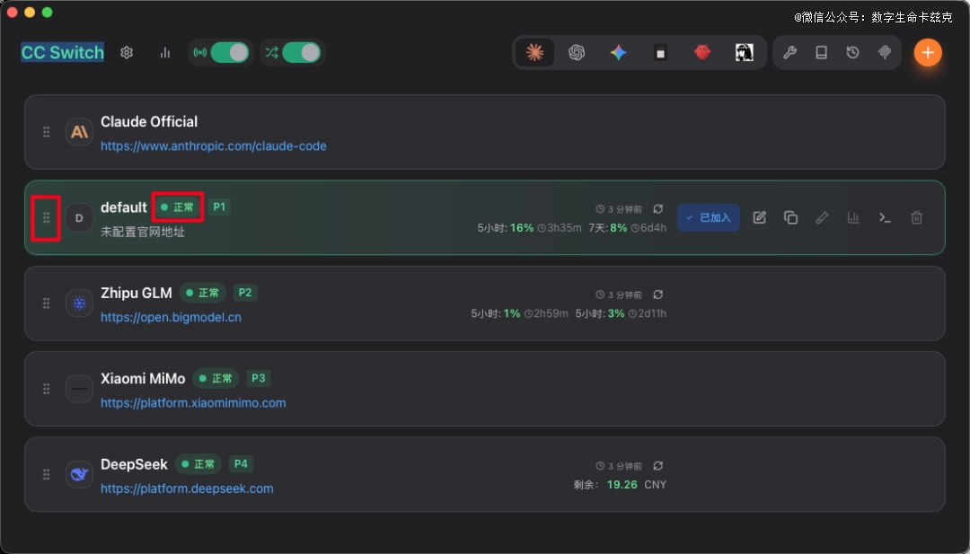 这样CC Switch会优先列表上面的供应商进行路由,碰到故障就自动往下一家切。每个供应商卡片上会显示一个健康状态徽章。