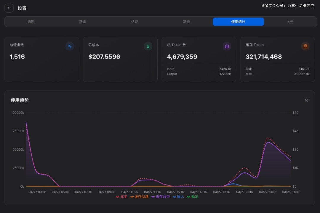 除了用量,CC Switch还提供了更详细的使用统计,可以更直观地看到每个时间段的成本消耗。