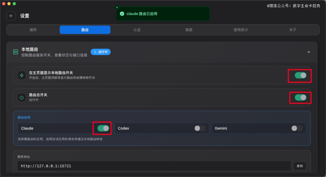 然后在应用路由区域启用Claude路由,把Claude Code的请求接到本地代理上。