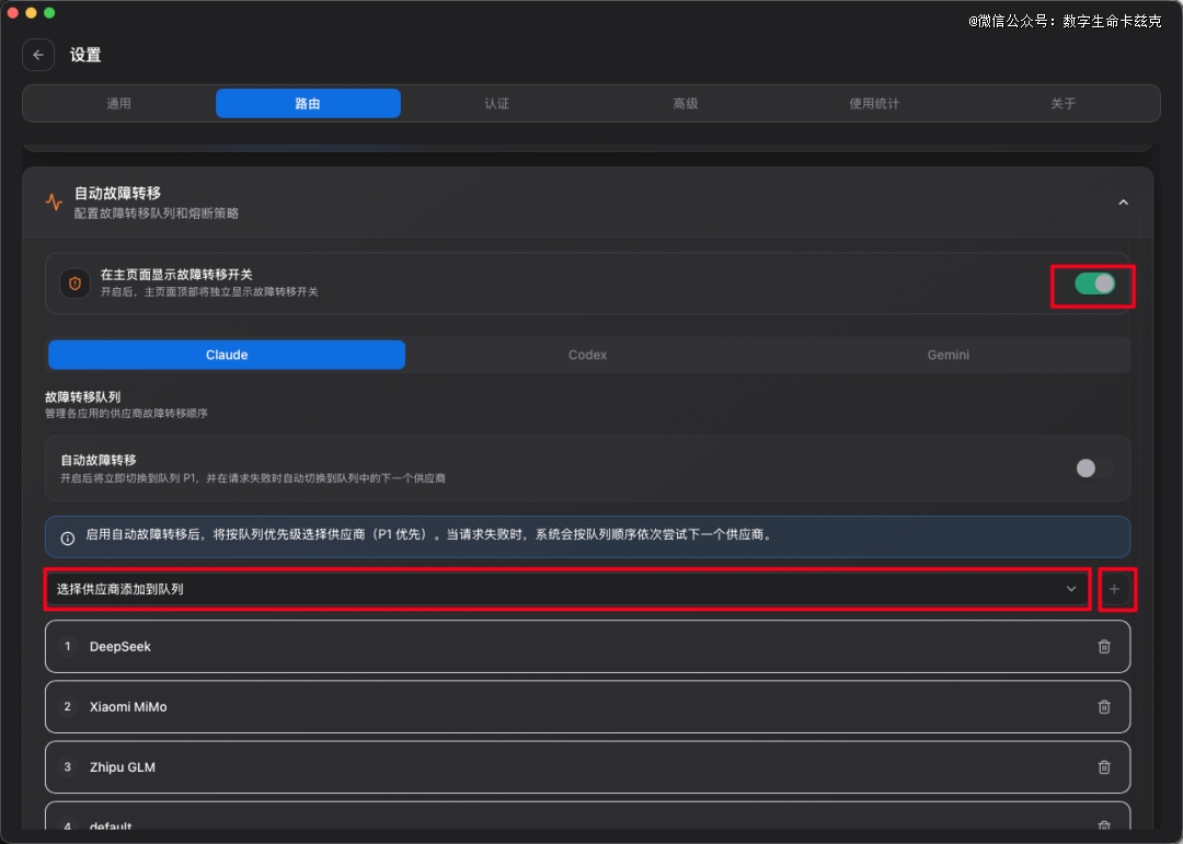 然后我们打开自动故障转移,选择Claude,再点添加供应商,把你要做备用的几家加进队列。