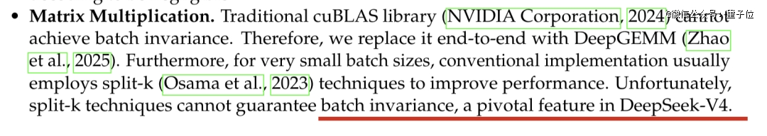 矩阵乘法方面,V4在大多数场景中放弃split-K,转而做更受约束的 batch-invariant GEMM。他们用自研DeepGEMM替代了通用的cuBLAS。