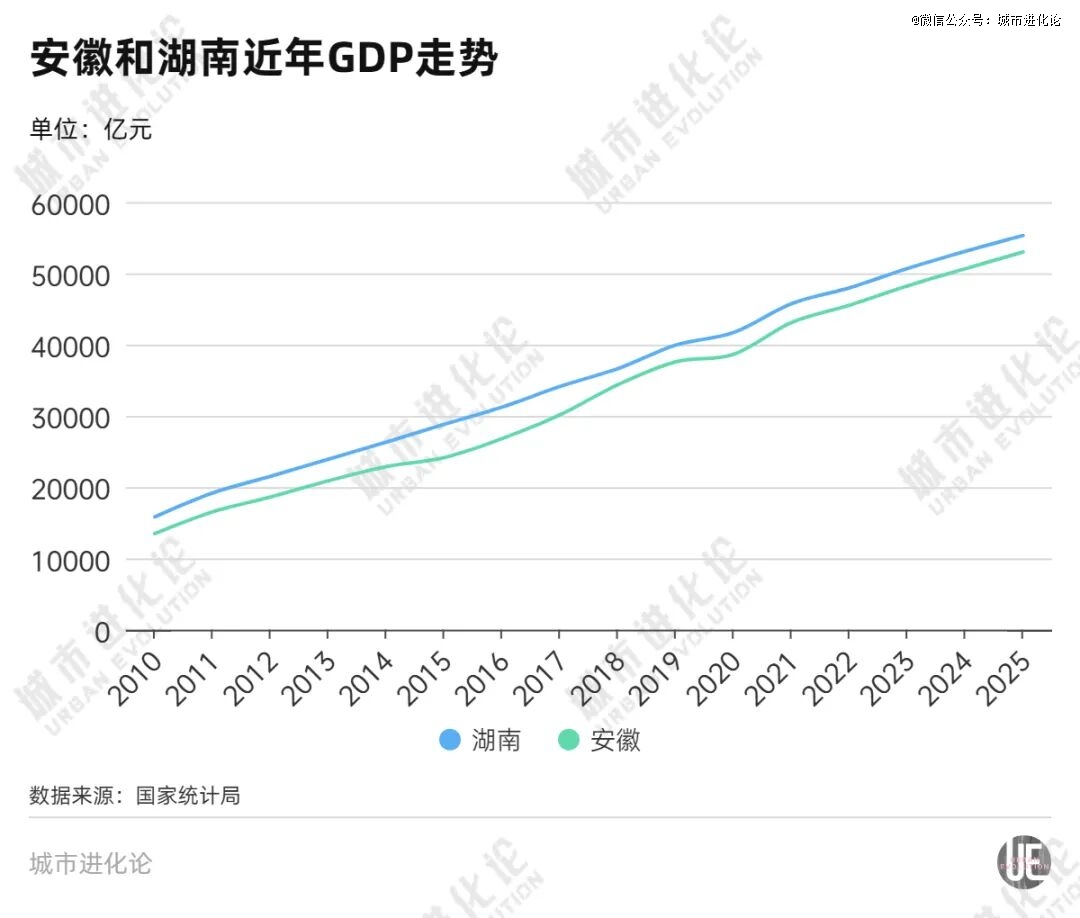 如今两年过去,两座省份距离渐进,仅从逐年一季度数据来看,GDP差距从2024年的644.8亿元缩小至今年的142.1亿元;而开启“第二曲线”,还只是写进湖南发展规划中的目标。