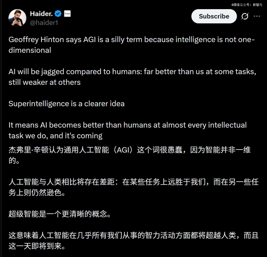 在Hinton看来,真正有意义的是「超级智能(superintelligence)」。它的定义很清楚——在几乎所有人类能做的智力任务上都比我们强。我们相信它正在到来。