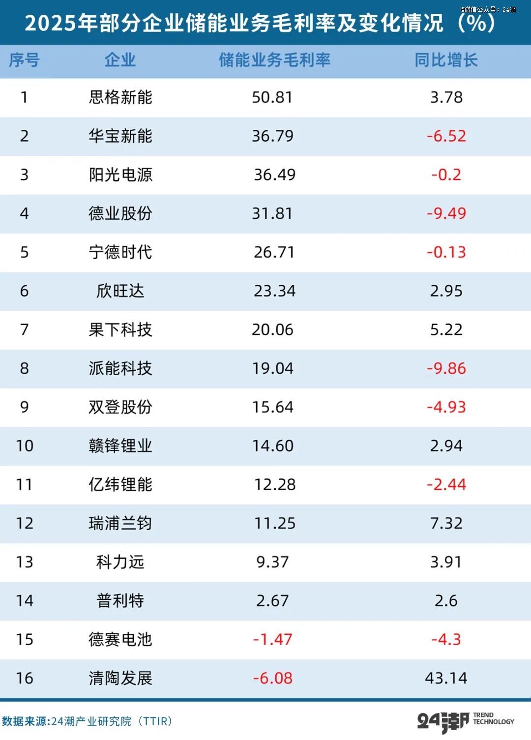 24潮产业研究院(TTIR)统计发现,目前16家公布2025年年报的储能上市企业中,8家企业“储能业务毛利率”出现下降,涵盖宁德时代、德业股份、亿纬锂能、派能科技等老牌实力玩家;另外9家企业储能业务毛利率低于20%,其中科力远、普利特储能毛利率仅为个位数,德赛电池、清陶能源毛利率更是为负。