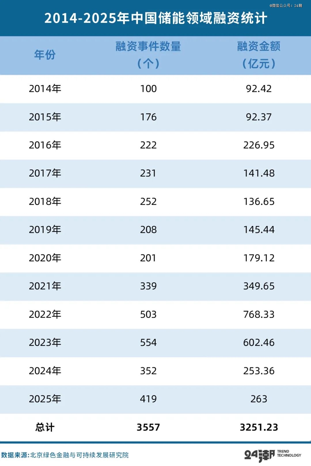 首先看一级市场数据,据北京绿色金融与可持续发展研究院统计,2014年至2025年 ,中国储能领域一级市场累计发生3557 起融资事件 , 披露融资总额约3251亿元。