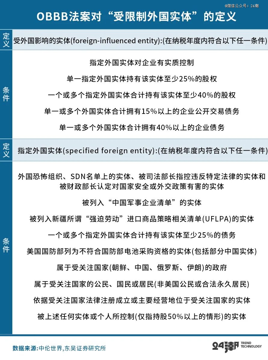 特朗普政府上台后,于2025年7月1日正式签署“大而美法案”(One Big Beautiful Bills,OBBB),大幅收紧对“受关注外国实体”(FEOC)的限制。其中对中国锂电池企业影响*的则是在IRA原有的“受关注外国实体”规则基础上,引入复杂严苛且更为细致的“被禁止外国实体”制度。